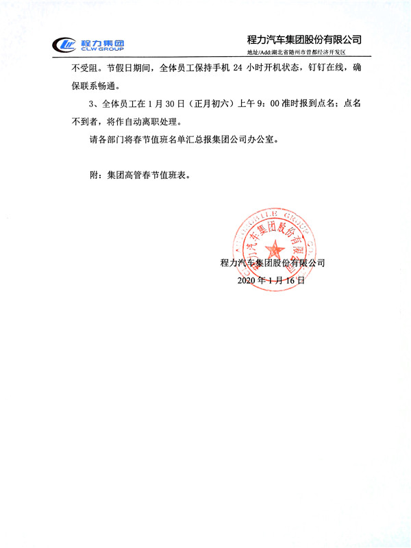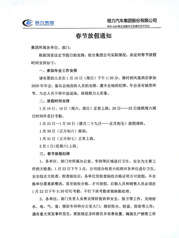 2020年喜迎新春佳節(jié),湖北程力集團(tuán)專用汽車有限公司春節(jié)工作安排: