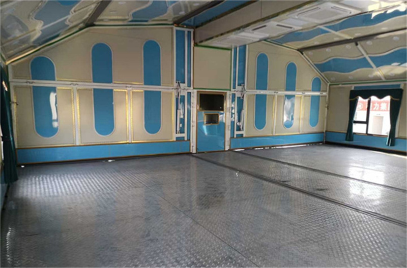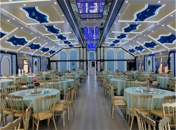 整車尺寸整車12米,箱體9.6米,箱體展開寬11.2米,長8.25米,內部適用面積93平方,同時可以容納150人左右,可以擺放10-16桌。