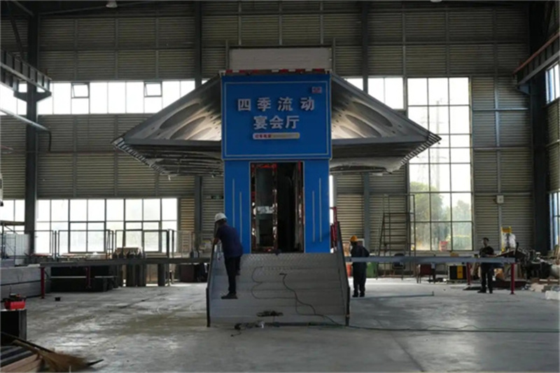 湖北程力9.6米移動宴席車可以擺放12-16桌,展開面積93平方,8.4×11.2米,一鍵遙控全液壓伸展,百變金剛。