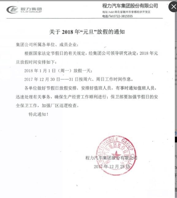 湖北程力2018元旦放假通知