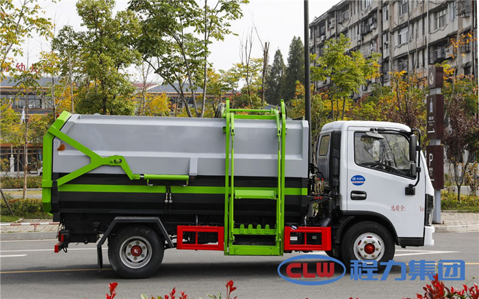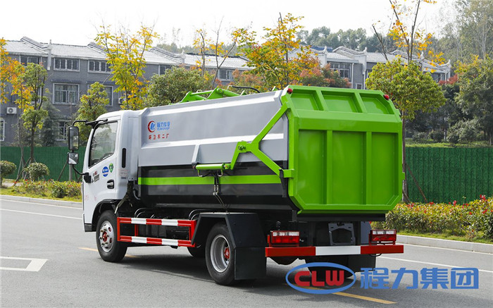 湖北程力國六東風多利卡5方掛桶垃圾車(不帶壓縮)程力威牌CLW5071ZZZD6型自裝卸式垃圾車廠家配置: 底盤配置:東風小多利卡國六5方掛桶垃圾車(不帶壓縮),采用東風原裝底盤,D6系列新款駕駛室,采用東風朝柴升級版CY4BK461國六排放發動機,95KW,130匹大馬力,萬里揚5擋變速箱,7.00鋼絲胎,國六車輛在國五基礎上增加了DPF顆粒捕捉器,多功能方向盤。 掛桶垃圾車是由密封式垃圾廂、液壓系統、操作系統組成,實現一車與多個垃圾桶聯合作業,廂體上的液壓提升機裝置可將垃圾桶吊上、放下,上下升降。箱體采用Q235碳鋼板焊接而成,小多利卡、大多利卡為邊3底4mm厚度,3950軸距以上為邊4底5mm厚度,箱體底部油缸舉升自卸,側面提升機可選鏈條式、拉桿式,后門手動開啟加裝手電一體加一千,箱體加厚請電議。 湖北程力國六東風多利卡5方掛桶垃圾車(不帶壓縮)程力威牌CLW5071ZZZD6型自裝卸式垃圾車多方位圖片;