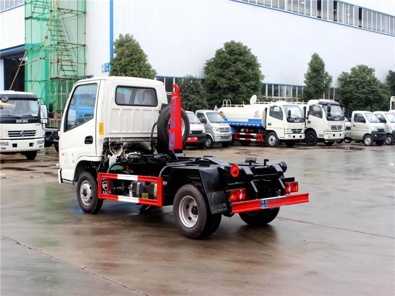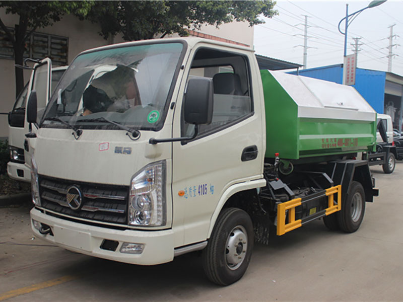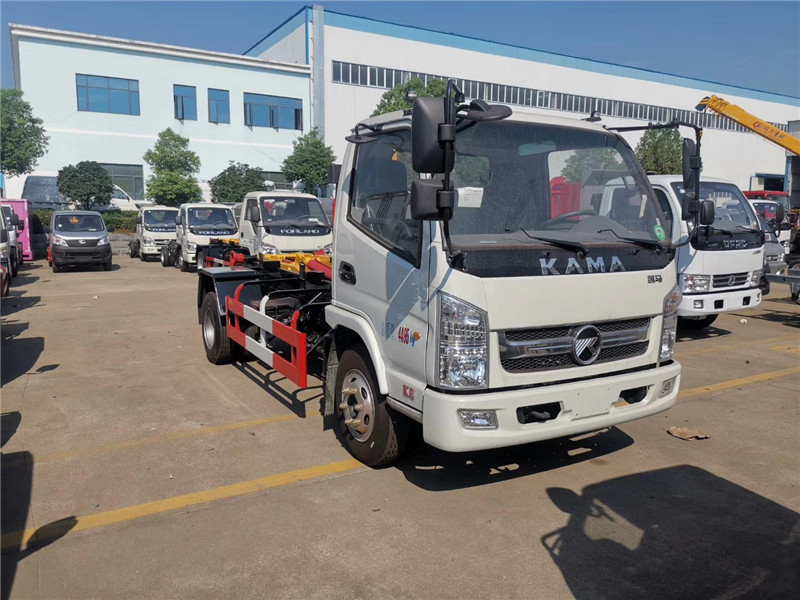 凱馬4方勾臂式垃圾車底盤配置: 凱馬勾臂式垃圾車,采用凱馬原廠KMC1036Q280DP6型號載貨汽車底盤,單排駕駛室。采用濰柴WP2.1Q82E50型號國六發動機,2088ml排量,5檔手動變速箱,2600mm軸距,配6.00-14LT型號輪胎,帶方向助力、離合助力、ABS防抱死系統、冷暖空調、機械減震座椅,配置豐富實用,駕乘舒適性高。 湖北程力凱馬3-4方勾臂式垃圾車專用功能特點: 凱馬勾臂式垃圾車的收運方式是目前世界上廣泛采用的垃圾收運方式,可以實現一車多箱,大大降低了使用成本,提高工作效率。 勾臂式垃圾車同時具備貨物自卸和箱體自動裝卸兩種功能,而且這兩種功能由一個拉臂車完成,工作效率高。這兩種功能的操作和轉換都是由液壓系統實現的。 凱馬3-4方勾臂式垃圾車,垃圾箱操作方法: 1、將鎖緊鉤操作手柄推至收回位置,鎖緊油缸收回,使鎖緊架收回并將翻轉架與附車架鎖緊固定; 2、將拉臂操作手柄拉起到伸起位置,拉臂油缸伸出,活動拉臂繞翻轉翻轉架前鉸鏈軸旋轉,拉臂處于鉤箱位置,適當調整拉臂鉤高度并與箱體彎鉤對準; 3、當拉臂鉤鉤到箱體彎鉤時,繼續推下拉臂操作手柄到落下位置,使垃圾箱體繼續上車; 4、當垃圾車箱體落放到附車架上后,松開拉臂操作手柄使其回到中位,再將鎖緊鉤操作手柄拉起至鎖緊位置,鎖緊油缸伸出,使鎖緊架翻起并將翻轉架與垃圾箱體鎖緊固定,松開手柄使之回中位; 完成垃圾車箱體的裝車工作,松開取力器,整車可以運輸行駛