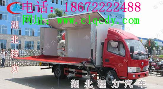 流動(dòng)舞臺(tái)車(chē)的結(jié)構(gòu)功能說(shuō)明:流動(dòng)舞臺(tái)車(chē):通過(guò)機(jī)械裝置展開(kāi)、搭建成具有頂棚和舞臺(tái)版演出的舞臺(tái),并配備安裝舞臺(tái)燈光、音響等所需的專(zhuān)門(mén)裝置及電源接口等廂式專(zhuān)用車(chē)輛