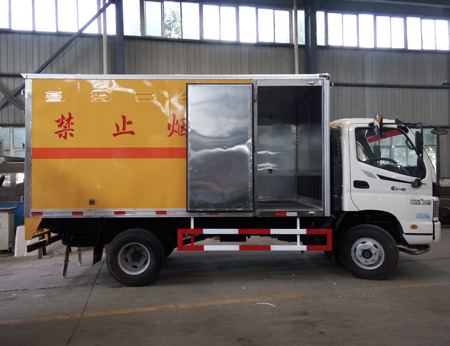 專用功能說明: 1、爆破器材運輸車底盤的型號可分為:東風、江鈴、江淮、奧鈴、時代、歐曼、慶鈴、解放等。驅動形式可分為:雙驅動和四驅動,按額定載質量有0.5噸—9.9噸(國防科工委要求最大上戶噸位不超過10噸)。 2、廂體分為兩部分:A:運輸炸藥;B:運輸雷管(抗暴容器);C:炸藥,雷管同時運輸(廂體必須隔倉,分倉運輸,加裝抗爆容器)。廂體為雙層金屬骨架結構,外部為冷扎鋼板,內壁采用鋁合金板蒙面,夾層為隔熱阻燃材料填充。設置對開門,如需安裝抗暴容器則增開側門,側壁設有防雨功能自然通風窗口,以使廂內外空氣流動,廂體內部做防靜電處理,廂體底部與廂內前部鋪有阻燃導靜電膠板,并與底盤等電位連接,通過車輛后端的導靜電裝置與大地相連,可防止靜電火花的產生和車輛靜電及時釋放,提高爆破器材運輸車的安全性。廂體內部前面和側面裝有固定拉環,與捆綁帶使用捆綁貨物以避免移動,保證安全。 3、 感煙報警器:是感測車廂內火情的專用裝置,安裝在車廂內頂部,并與駕駛室內報警裝置連接,當有火情煙霧出現,在駕駛室進行蜂鳴報警通知駕駛員,保證及時消除險情。 4、防盜報警器:為了保證安全,在車廂后方和側面開設有門,在各門器框上方安裝有門磁開關報警器(根據用戶要求選裝防盜監視器。行車記錄儀等)當廂門被打開時,駕駛室內的蜂鳴器發出報警聲音,不使用時可將駕駛室內的控制開關關閉?杀WC在行駛過程中,整車始終處于受控狀態。 5、整車發動機排氣裝置采用前置式,并安裝有排氣火花熄滅器(防火罩),防止熱源對爆炸物產生不良影響。 6、底盤上裝有兩條拖地導靜電膠帶,廂體外側安裝示廓標記燈以及手提滅火器等安全裝置。 7、車身顏色為黃色,并有“嚴禁煙火”和“爆”字樣,貼有反光標識。 目前炸藥運輸車,雷管運輸車,防爆車,以及煙花爆竹運輸車都歸為爆破器材運輸車,這并且類車輛都具有廂體強度高、防火阻燃、防雨、防止靜電火花、煙火報警和防盜報警等主要功能,現在的爆破器材運輸車已經脫離原來的平板運輸,而改為廂式運輸 ,所以本次介紹的爆破器材運輸車都為廂式運輸。 排氣火花熄滅器