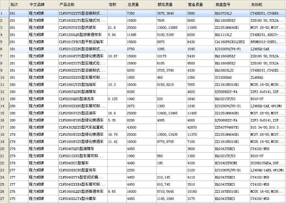 2016年是實現“十三五”規劃開局之年,又適逢環保部實施國五排放升級,為適應市場需要,程力公司在282批新上公告56個,283批又跟進了56個公告,2批公告總量達到112個,其中國五車型102個,新能源車型9個。車型覆蓋綠化噴灑車、壓縮式垃圾車、高空作業車、吸糞車、車廂可卸式垃圾車、自裝卸式垃圾車、掃路車、吸污車、壓縮式對接垃圾車、清洗吸污車、洗掃車、清洗車、運油車、鋁合金運油車、腐蝕性物品罐式運輸車、鮮奶運輸車、粉粒物料運輸車、供液車、冷藏車、散裝飼料運輸車、清障車、舞臺車、售貨車、同步碎石封層車、平板運輸車、純電動車輛等,可謂是新品大盤點。以上車型中,不僅有傳統車型,也不泛為適應市場新形勢而開發的智能型車。 下面是湖北程力國五車輛一些公告