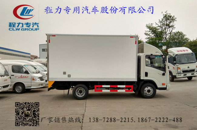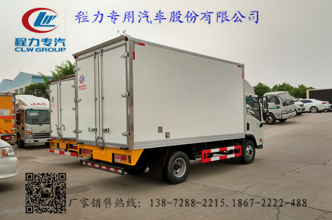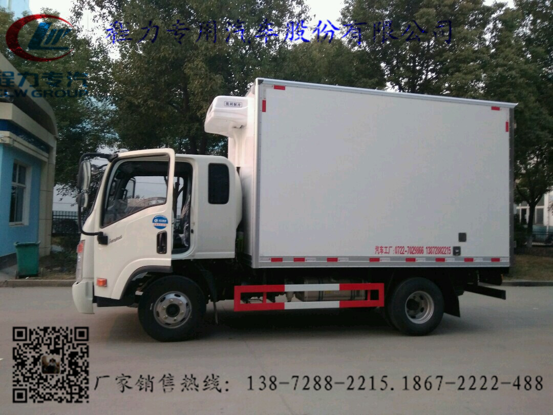 2.上裝配置:廂體內部有效尺寸:單排長4.05米(排半駕駛室的3.75)×寬2.05米×高2.2米,內外玻璃鋼,隨客戶選擇內置槽鋼焊接骨架或者玻璃纖維超輕高強度骨架,填充8cm厚聚氨酯保溫,不銹鋼包角,不銹鋼門框,不銹鋼門鎖件,花紋鋁底板,配后雙開門,該車可選裝單側開門,-5度或者-18度制冷機組可以選擇。選裝美國進口開利或者冷王制冷機組。